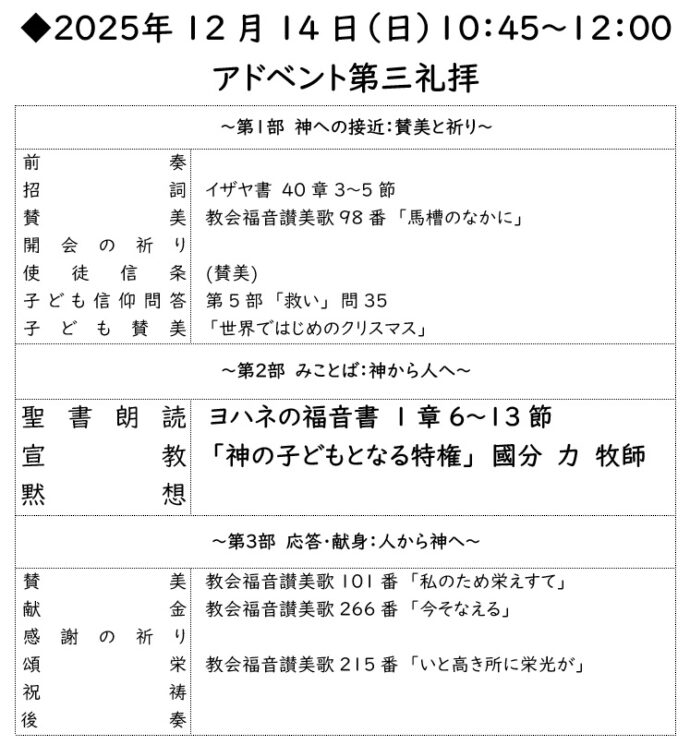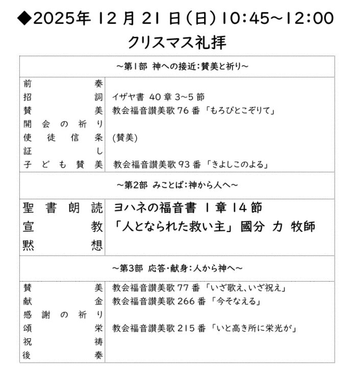 (2025年11月30日23:05更新) 2025年12月の予定は写真の通りです。初めての方もお気軽においでください。各集会についてはこちら …続きを読む